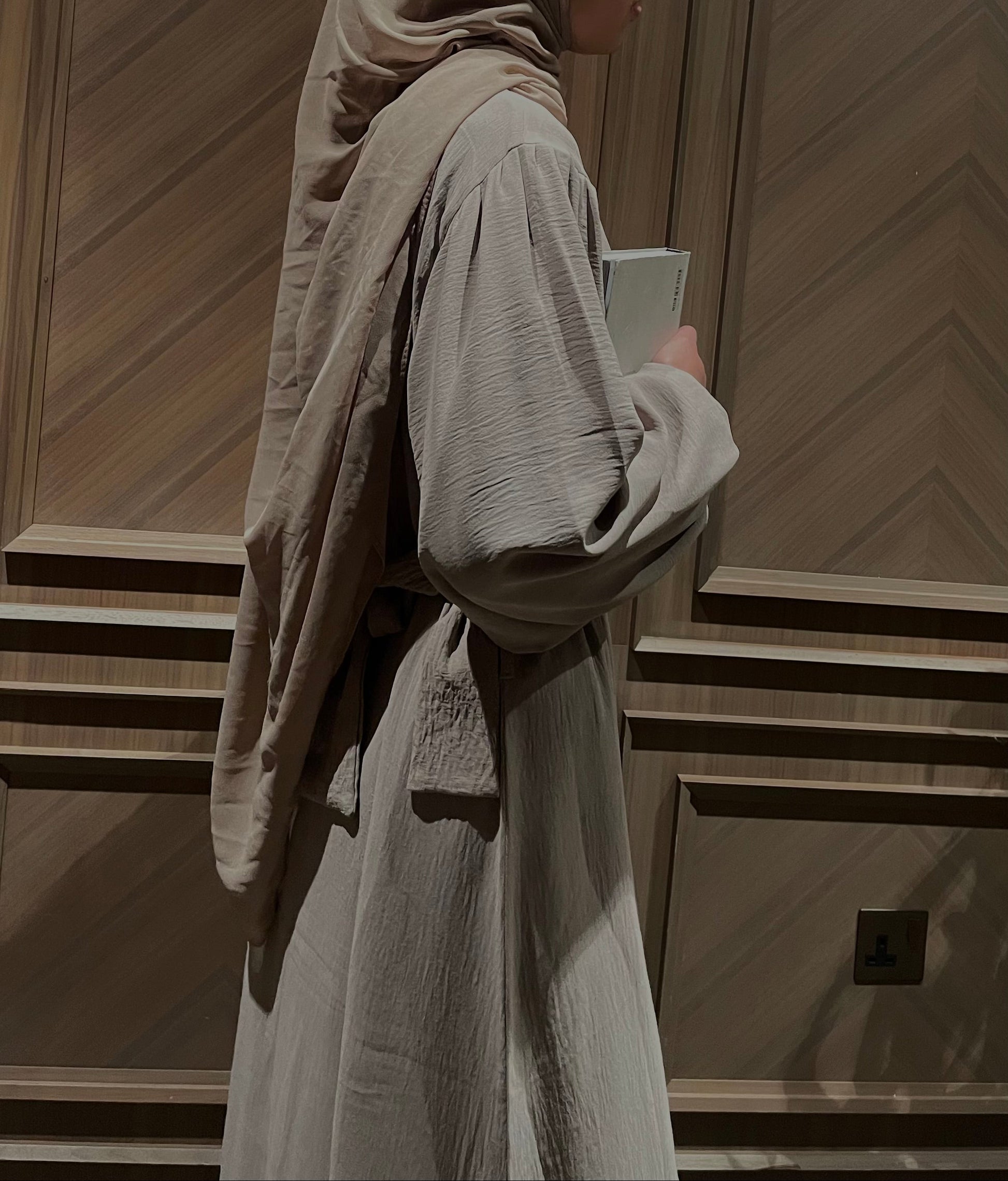 Soft, stonewashed linen abaya with balloon sleeves and pleated details on the cuff, collar, and shoulders. It's elegant, timeless, and comfortable. The fabric flows down loosely and can be worn on warm days, but also beautiful with knitted layers in winter.